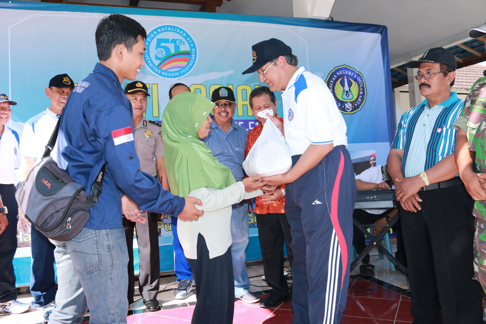 Kegiatan bakti sosial dibuka dengan penyerahan secara simbolis paket sembako oleh Rektor UNY pada salah seorang warga. Jumiyem, warga Putat 3 Patuk merasa senang dengan adanya bakti sosial ini. Jumiyem mendapat paket sembako yang menurutnya akan digunakan untuk menopang kebutuhan keseharian di mana suaminya berprofesi sebagai petani dengan 1 anak yang telah duduk di bangku SMK. (dedy)