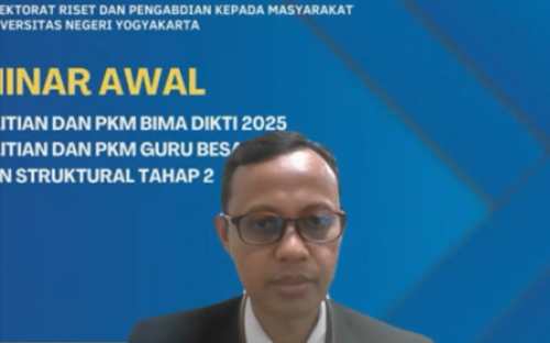 Direktorat Riset dan Pengabdian kepada Masyarakat Universitas Negeri Yogyakarta menyelenggarakan kegiatan seminar awal yang berlangsung selama dua hari. Pada hari Senin, 30 Juni 2025 dilaksanakan kegiatan Seminar Awal Penelitian dan PkM BIMA Dikti 2025, sedangkan hari Selasa, 01 Juli 2025 dilanjutkan kegiatan Seminar Awal Penelitian dan PkM Guru Besar dan Dosen Struktural Tahap 2. Kegiatan ini diikuti oleh para dosen yang berasal dari berbagai fakultas di Universitas Negeri Yogyakarta melalui platfrom zoom.