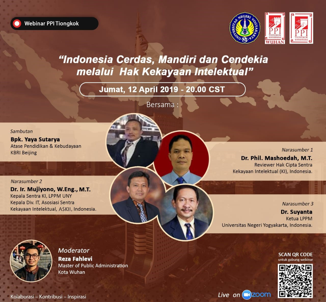 Perhimpunan Pelajar Indonesia Tiongkok (PPIT), menggelar acara webinar atau seminar online (12/04/2019) dengan mengusung tema “Indonesia Cerdas, Mandiri dan Cendekia melalui Hak Kekayaan Intelektual”. Acara ini dibuka dengan serta sambutan oleh ketua PPIT, Fadlan Muzaki dengan menghadirkan pembicara yakni Dr. Suyanta, Ketua LPPM Universitas Negeri Yogyakarta, Dr. Mujiyono, selaku Kepala Sentra Kekayaan Intelektual-KI, LPPM Universitas Negeri Yogyakarta sekaligus perwakilan Sentra Divisi IT Asosiasi Sentra Kekayaan Intelektual, ASKII-Indonesia, serta Dr.phil. Mashoedah, reviewer Hak Cipta Kekayaan Intelektual LPPM Universitas Negeri Yogyakarta. Kegiatan ini juga menjadi salah satu bentuk program kerja KI LPPM Universitas Negeri Yogyakarta di kancah Internasional karena tema kegiatan ini sejalan dengan visi Universitas Negeri Yogyakarta menuju World Class University.