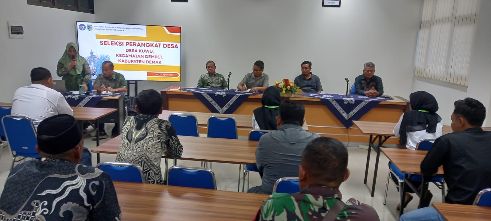 Sabtu, 31 Agustus 2024, Direktorat Riset dan Pengabdian kepada Masyarakat UNY bekerjasama dengan pemerintah Kalurahan Kuwu, Kecamatan Dempet, Kabupaten Demak, menyelenggarakan seleksi perangkat Desa ini untuk pengisian formasi sekretaris desa. Jumlah peserta seleksi sebanyak 3 orang peserta. Kegiatan dimulai dari jam 08.00 – 16.00 WIB bertempat di ruang sidang DRPM UNY dan Laboratorium Pustik UNY, sedangkan materi Ujian meliputi ; Ujian Tes Akademik (CAT), Ujian Tes Praktik Komputer dan Ujian Wwancara. Kegiatan ini dihadiri oleh Sekretaris Direktur DRPM, Ketua Tim Seleksi UNY, panitia DRPM, panitia kalurahan, Babinsa, Babinkantipmas dan peserta seleksi.