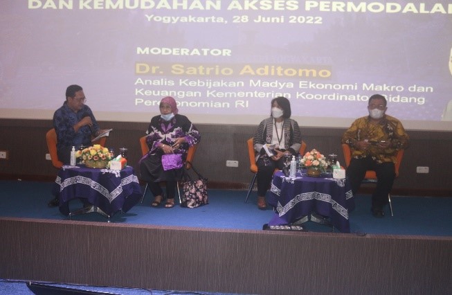 Seminar ini juga menghadirkan Kepala Biro Komunikasi, Layanan Informasi, dan Persidangan Haryo Limanseto, Dr.Iskandar Simorangkir, S.E, MA Deputi Bidang Koordinasi Ekonomi Makro dan Keuangan Kemenko Perekonomian RI sebagai pengantar diskusi, dan juga menghadirkan tiga narasumber yaitu Guru Besar Fakultas Ekonomi Universitas Negeri Yogyakarta sekaligus Ketua Pusat Studi Inovasi Inkubasi Bisnis dan HKI LPPM Universitas Negeri Yogyakarta Prof. Nahiyah Jaidi Faraz, M.Pd., Kepala Dinas Koperasi dan Usaha Kecil Menengah Provinsi Daerah Istimewa Yogyakarta Srie Nurkyatsiwi, dan Asisten Deputi Pasar Modal dan Lembaga Keuangan Kemenko Perekonomian Gede Edy Prasetya, dimoderatori oleh Analis Kebijakan Madya Ekonomi Makro dan Keuangan Kemenko Perekonomian Satrio Aditomo, dan jajaran pimpinan di UNY. Acara selesai pada pukul 12.00 WIB dan diakhiri dengan foto bersama. (heri-lppm)