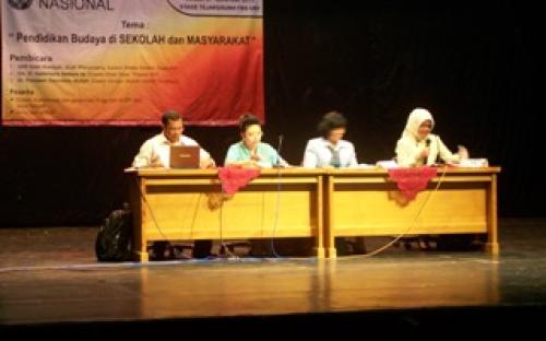 Bangsa Indonesia merupakan bangsa yang pluralis yang memiliki berbagai macam tradisi, adat-istiadat dan keragaman budaya. Seiring dengan masuknya teknologi dan informasi global, kebanggaan dan rasa memiliki budaya tersebut mengikis. Masyarakat terutama generasi muda lebih menyenangi budaya asing yang di anggap lebih maju, modern dan tidak kuno. Budaya lokal dianggap sebagai sesuatu yang kuno dan tidak bermanfaat, terlebih dalam mempertahankan kelangsungan hidup secara layak dan praktis. Pergeseran budaya tradisi menuju budaya global ini dirasakan hampir di seluruh aspek kehidupan. Permasalahan tersebut membuat masyarakat pemerhati budaya bertanya mengenai kelangsungan generasi muda Indonesia. Generasi muda sebagai tonggak berlangsungnya negara sudah berkiblat kepada prinsip dan budaya barat untuk menyelesaikan berbagai tantangan global yang masuk. Oleh karena itu, diperlukan penyegaran pembelajaran ilmu budaya di sekolah dan masyarakat untuk menganalisis dan mengemas kembali wujud tersebut agar menjadi solusi kegelisahan budaya Indonesia. Campur tangan dari penentu kebijakan bidang pendidikan dan masyarakat mutlak diperlukan untuk memperkuat budaya lokal generasi muda di sekolah. Pemangku adat, dalam hal ini adalah keraton, juga diperlukan untuk bekerja sama dalam mencari pencerahan sebagai komunitas penyangga kebudayaan. Fungsi keraton perlu dihidupkan lag, dikenalkan kepada masyarakat luas, sehingga terjadi komunikasi antara pemangku adat dan masyarakat, sehingga diharapkan dapat menemukan solusi permasalahan budaya pada generasi muda di masa kini, demikianlah paparan Dra. GRAy. Koes Murtiyah Wandanasari, M.Pd. beserta Drs. R, Kadarmanta Baskara Aji dan Dr. Purnawan Basundoro. M.Hum sebagai Pemakalah Utama, dalam kegiatan Seminar Nasional "Pendidikan Budaya di Sekolah dan Masyarakat", yang diadakan oleh Lembaga Penelitian dan Pengabdian Kepada Masyarakat UNY, pada tanggal 27 Nopember 2012 di Gedung Pendopo Tejakusuma, Fakultas Bahasa dan Sastra UNY. Dan Seminar Nasional ini dibuka oleh Prof. Dr. Anik Ghufron selaku Ketua LPPM UNY. Disamping itu juga, dipertunjukkan seni tari Jathilan yang berasal dari Magelang sebagai pengiring pembukaan kegiatan Seminar Nasional ini.(AD)