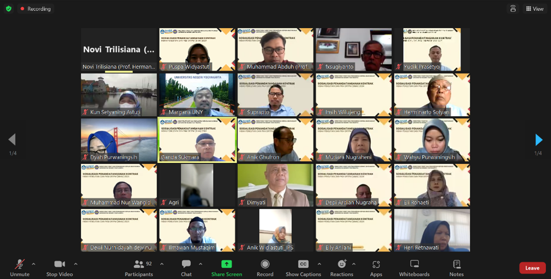 Direktorat Riset dan Pengabdian kepada Masyarakat UNY menyelenggarakan kegiatan sosialisasi penandatanganan kontrak penelitian dan PkM DRTPM (Bima) 2024 pada hari Senin, 19 Agustus 2024. Kegiatan ini dihadiri oleh Bapak. Prof. Dr. Margana, M.Hum., M.A. selaku Wakil Rektor Bidang Riset, Kerjasama, Sistem Informasi, dan Usaha serta peserta sosialisasi yang merupakan peneliti atau pengabdi. Dalam sambutannya, Bapak. Prof. Dr. Margana, M.Hum., M.A. menyampaikan bahwa, “Bidang RKSIU, DKSIU, dan DRPM yang merupakan bagian dari UNY siap memfasilitasi Ibu dan Bapak dalam pelaksanaan penelitian dan PkM. Mohon maaf apabila selama kami mengawal Bapak/Ibu mulai dari awal pengajuan proposal sampai diumumkannya hibah penelitian dan PkM pada tahun 2024 ada hal-hal yang kurang. Terima kasih, selamat bekerja Bapak/Ibu. Semoga Tuhan Yang Maha Esa senantiasa membersamai Bapak/Ibu dalam melaksanakan tugas dan tanggung jawab yang mulia penelitian dan PkM tahun 2024”. Bapak Prof. Dr. Yudik Prasetyo, S.Or., M.Kes. selaku Direktur DRPM UNY menyampaikan bahwa, “Alhamdulillah kita panjatkan puji syukur kepada Allah sehingga sore ini kita dapat melakukan kegiatan sosialisasi penandatanganan kontrak. Penandatanganan kontrak dilaksanakan pada hari Selasa, 20 Agustus 2024 mulai pukul 08.00 WIB dan untuk seminar awal akan dilaksanakan pada hari Kamis, 22 Agustus 2024. Alhamdulillah di tahun 2024 dapat lolos sejumlah 136 judul. Perlu upaya dan usaha yang luar biasa untuk kesiapan proposal-proposal di tahun 2025”. Terkait dengan penjelasan pengelolaan keuangan dipaparkan oleh Ibu Prof. Heri Retnawati, S.Pd., M.Pd. selaku Direktur Direktorat Perencanaan dan Keuangan UNY, “Kami ucapkan selamat atas pencapaian Bapak/Ibu yang telah diperoleh terkait dengan riset tahun ini. Terkait anggaran pada tahun sekarang, untuk termin I memperoleh 80% dan untuk termin II memperoleh 20%. Bapak/Ibu mulai besok pagi sudah bisa memulai untuk tandatangan kontrak dan segera ditransfer sesuai dengan nomor rekening yang telah dicantumkan”. Selanjutnya, terdapat pemaparan terkait dengan pengajuan Ethical Clearance dari Pusat Komisi Etik DRPM UNY oleh Ibu Retna Hidayah, Ph.D. seperti halnya prosedur pengajuan ethical clearance. Penjelasan terkait HKI dan ICERI dipaparkan oleh ketua Pusat Sentra KI dan SNI yaitu Ibu Prof. Dr. Eli Rohaeti, M.Si. Kegiatan inti sosialisasi ini disampaikan oleh Bapak Suprapto, Ph.D. selaku Sekretaris Direktur DRPM UNY. Dalam pemaparannya Beliau juga menyampaikan pesan bahwa terdapat hal-hal yang harus diperhatikan oleh peneliti dan pengabdi yaitu tanggal-tanggal penting, dokumen-dokumen yang diupload, penggunaan anggaran, dan luarannya.Selain itu, peneliti dan pengabdi juga harus memperhatikan kewajiban-kewajibannya. Salah satunya yaitu memenuhi luaran penelitian yang dijanjikan. Semoga dengan adanya kegiatan sosialisasi ini dapat memupuk dan menumbuhkan semangat para peneliti dan pengabdi kedepannya. (Puspa)