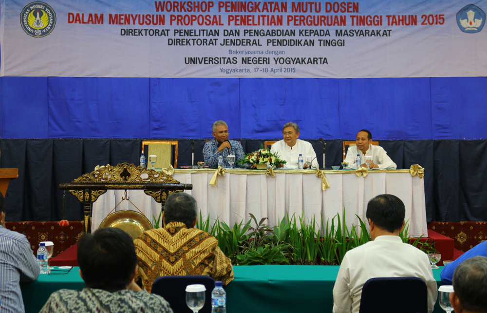 Dalam rangka menghadapi era globalisasi dan perkembangan ilmu pengetahuan dan teknologi, Perguruan Tinggi senantiasa dituntut terus menerus mengembangkan kemampuannya agar dapat menghasilkan lulusan yang bermutu, mandiri dan dapat bersaing dipasaran kerja baik nasional maupun internasional.Kebijakan Kemenristek Dikti, Direktorat Penelitian dan Pengabdian kepada Masyarakat (Ditlitabmas) kegiatan penelitian pada Perguruan Tinggi merupakan konsekuensi logis dari kebijakan strategis untuk mencapai tujuan Pengembangan Penelitian Perguruan Tinggi yang mandiri dan berdaya saing, menuju hilirisasi kerjasama dan industri/dunia usaha.Universitas Negeri Yogyakarta melalui Lembaga Penelitian dan Pengabdian kepada Masyarakat (LPPM) UNY dipercaya oleh Direktorat Penelitian dan Pengabdian kepada Masyarakat (Ditlitabmas) Kemenristek Dikti untuk menyelenggarakan Workshop Peningkatan Mutu Dosen dalam Penyusunan Proposal Penelitian Perguruan Tinggi Tahun 2015 pada Jumat, 17 April 2015 di Hotel Inna Garuda Yogyakarta. Kegiatan ini diikuti sejumlah 78 dosen peneliti dari berbagai Perguruan Tinggi di wilayah DIY-Jateng yang terdaftar di Simlitabmas dan ditetapkan oleh Direktur Penelitian dan Pengabdian kepada Masyarakat, Kemenristek Dikti.Acara dibuka langsung oleh Rektor UNY Prof. Dr. Rochmat Wahab, M.Pd., M.A., selaku tuan rumah menyampaikan pada sambutannya bahwa kegiatan ini terangkai dengan kegiatan sebelumnya terkait hibah penelitian yang belum terdanai pada tahun sebelumnya dan merupakan kegiatan satu-satunya yang memberi kesempatan kepada peneliti untuk meningkatkan penelitiannya.Direktur Penelitian dan Pengabdian kepada Masyarakat (Ditlitabmas) Kemenristek Dikti, Prof. Agus Subekti, M.Sc., Ph.D., memberi pengarahan bahwa Direktorat Penelitian dan Pengabdian kepada Masyarakat berkerjasama dengan Universitas Negeri Yogyakarta, berupaya mewujudkan program-program unggulan pada perguruan tinggi di Indonesia melalui kebijakan penelitian di perguruan tinggi yang meliputi Penelitian Unggulan Perguruan Tinggi (PUPT), Program Riset Andalan Perguruan Tinggi dan Industri (RAPID), Masterplan Percepatan dan Perluasan Pembangunan Ekonomi Indonesia (MP3EI) dan Penelitian Unggulan Strategis Nasional (PUSNAS), dalam menuju hilirisasi.“Riset Perguruan Tinggi tidak hanya untuk komersialisasi saja tapi juga harus bisa memberi edukasi bagi masyarakat, tandas Agus Subekti.Agus Subekti menambahkan jika riset mau menuju ke komersialisasi maka proses penelitian hulu (eksplorasi) harus diperkuat; luaran yang sudah dihasilkan di hulu harus difasilitasi untuk proses di bagian hilir (produksi masal); perlu penguatan kelembagaan, SDM, investasi sarana dan prasarana penelitian serta operasional dibagian hulu maupun hilir; perlu penguatan jaringan kerja sama peneliti dengan industri/dunia usaha. (ags)