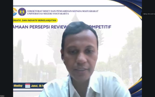 Kegiatan diawali dengan sambutan dan arahan dari Direktur DRPM UNY, Prof. Dr. Yudik Prasetyo, M.Kes. yang menyampaikan apresiasi dan ucapan terima kasih kepada para mitra perguruan tinggi yang telah berkenan hadir dan berpartisipasi dalam penyamaan persepsi reviewer PkM kompetitif. Dengan melibatkan para reviewer dari berbagai perguruan tinggi, diharapkan proses seleksi dapat menghasilkan proposal-proposal yang benar-benar berkualitas serta mampu memberikan manfaat nyata, baik bagi penguatan kelembagaan maupun bagi masyarakat dan Indonesia secara luas. Di akhir penyampaiannya, beliau juga menyampaikan permohonan maaf apabila dalam penyelenggaraan kegiatan masih terdapat kekurangan atau hal-hal yang kurang berkenan.